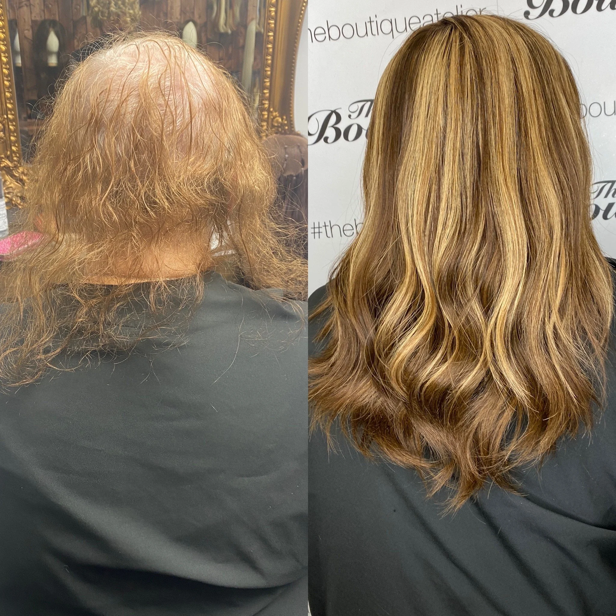 At The Boutique Atelier, we also offer bespoke human hair wigs tailored to your individual needs. Made from 100% ethically sourced human hair, these wigs provide a completely natural look and feel. Each wig is custom-crafted to match your hair colour, texture, and desired style, ensuring a seamless, personalised result. Our expert team will guide you through the process, from selecting the right wig to fitting and personalisation, ensuring you feel confident and comfortable. Whether for hair loss, thinning, or simply a new look, our custom wigs offer a beautiful, natural solution.